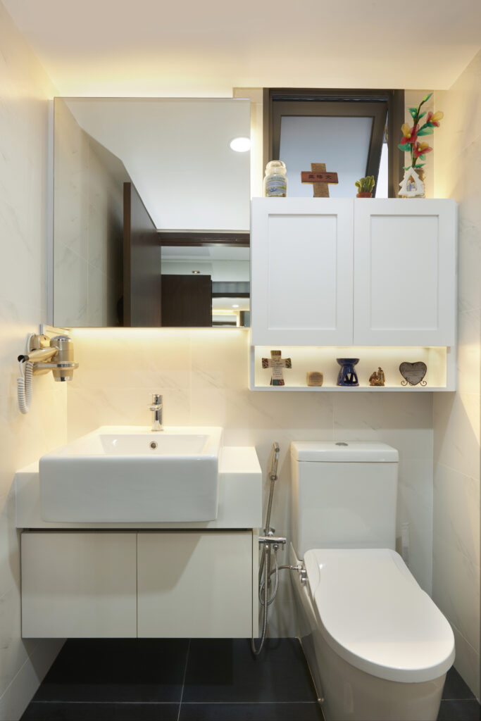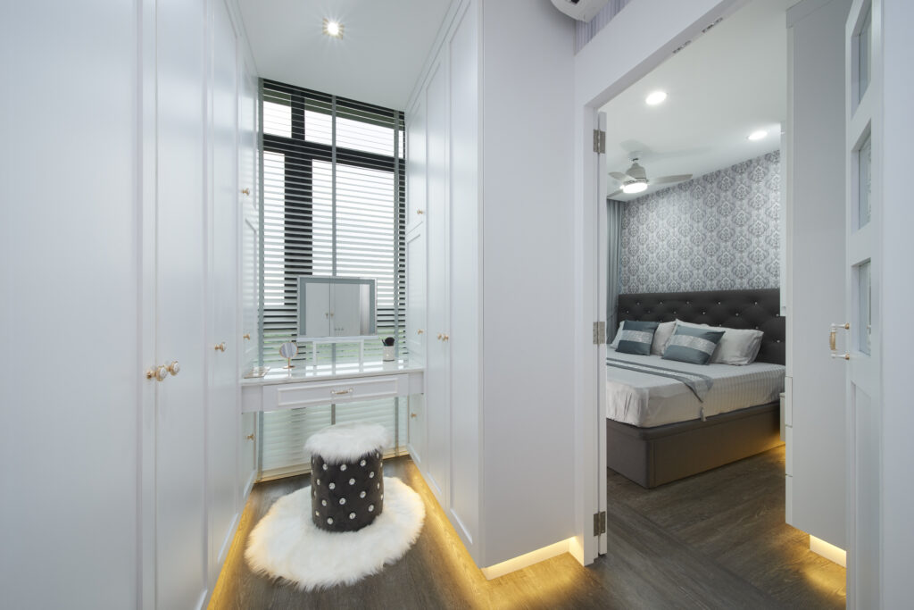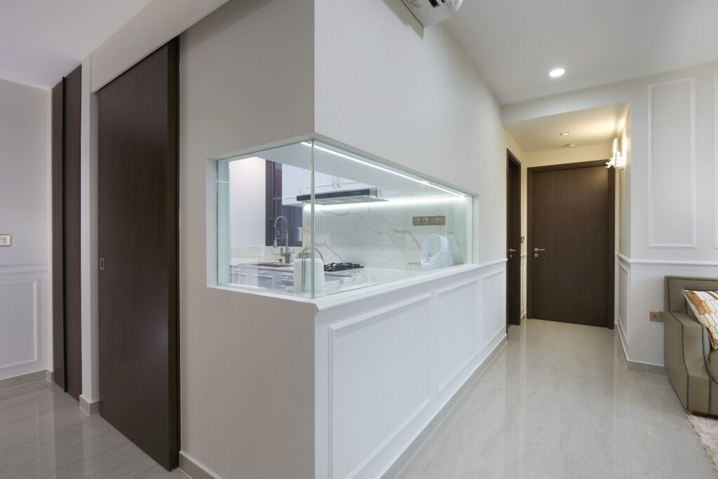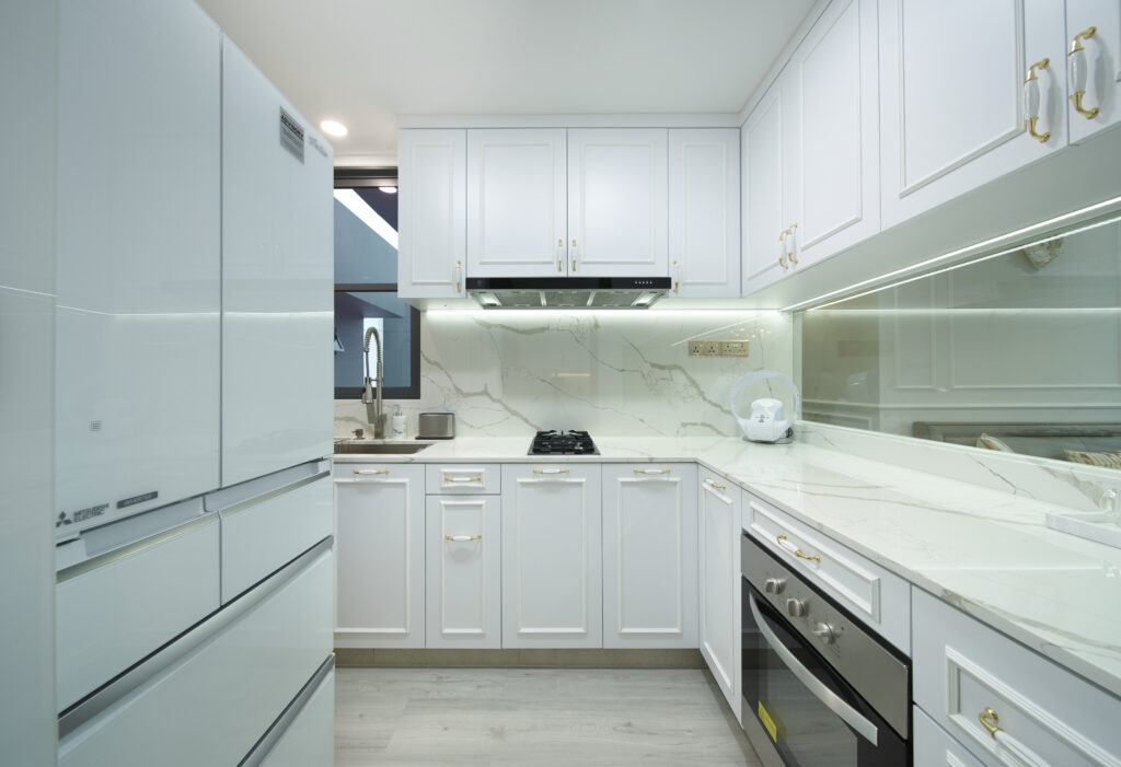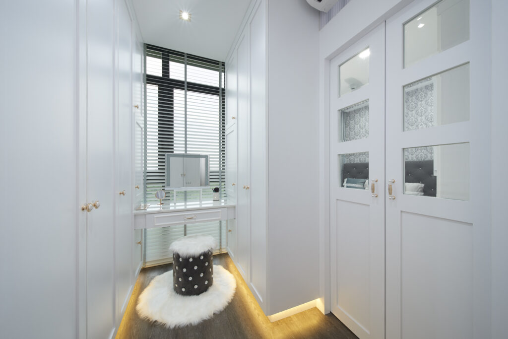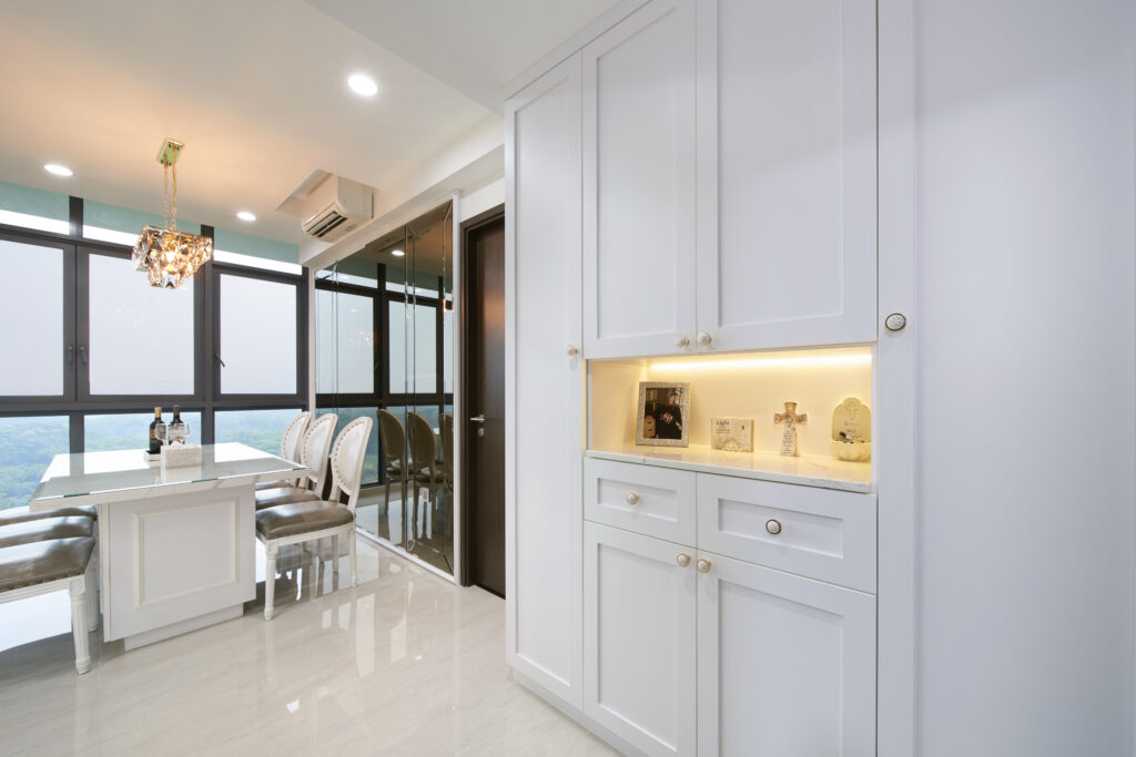 White dominates the colour scheme and creates an illusion of a larger space, turning the small home into a luxurious haven. All the cabinets are creatively customised to reach the ceiling, creating many clean vertical lines that lift the eye and mind, creating a state-of-the-art home.