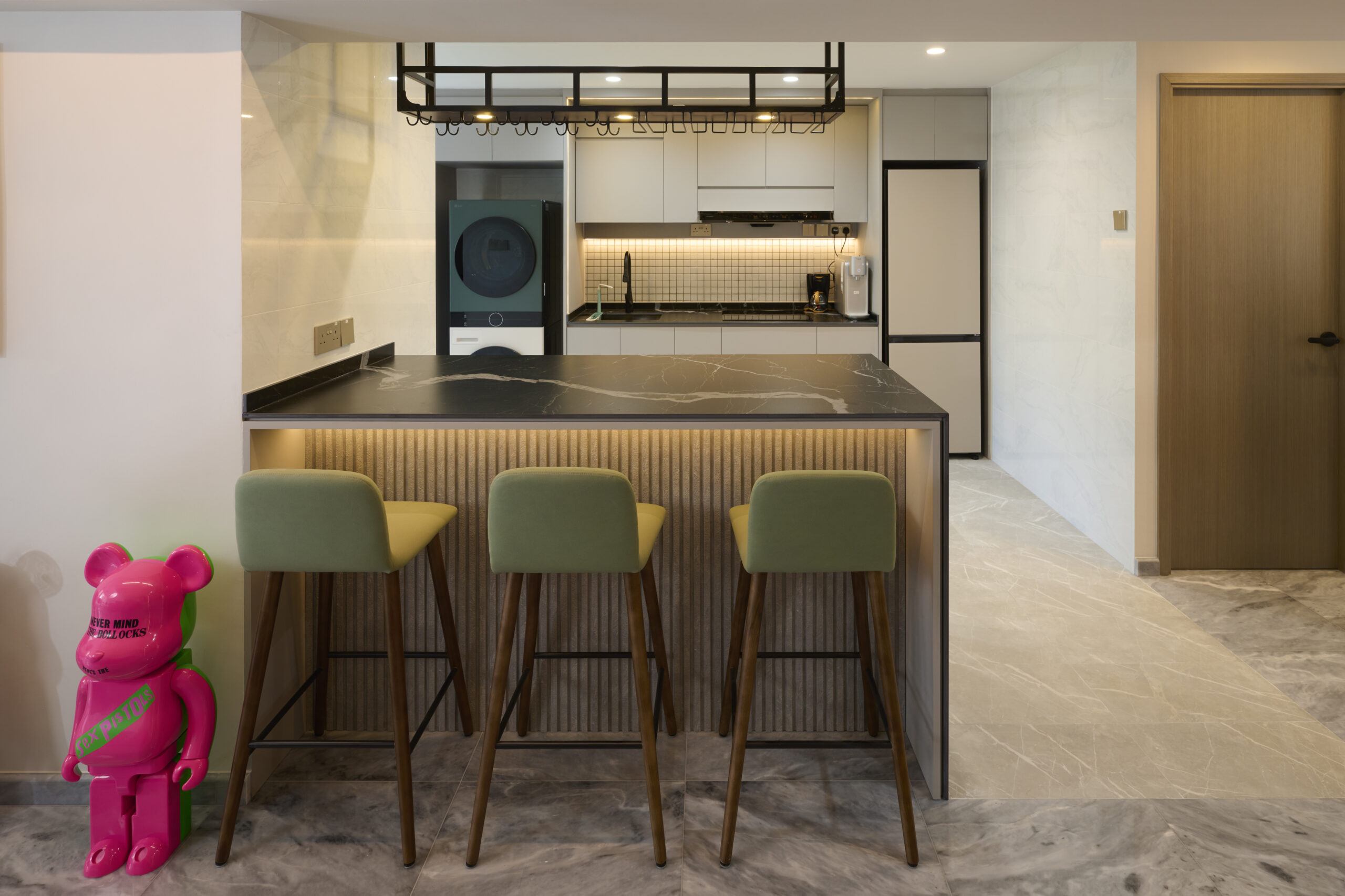Nestled in the heart of comfort, these rooms unfold like a story, each chapter more intriguing than the last. From the understated luxury of the marble floors to the playful array of collectibles, the space tells a story of a life rich in both style and substance. It's where every element, meticulously chosen, cultivates a sanctuary that's not just seen, but deeply felt.