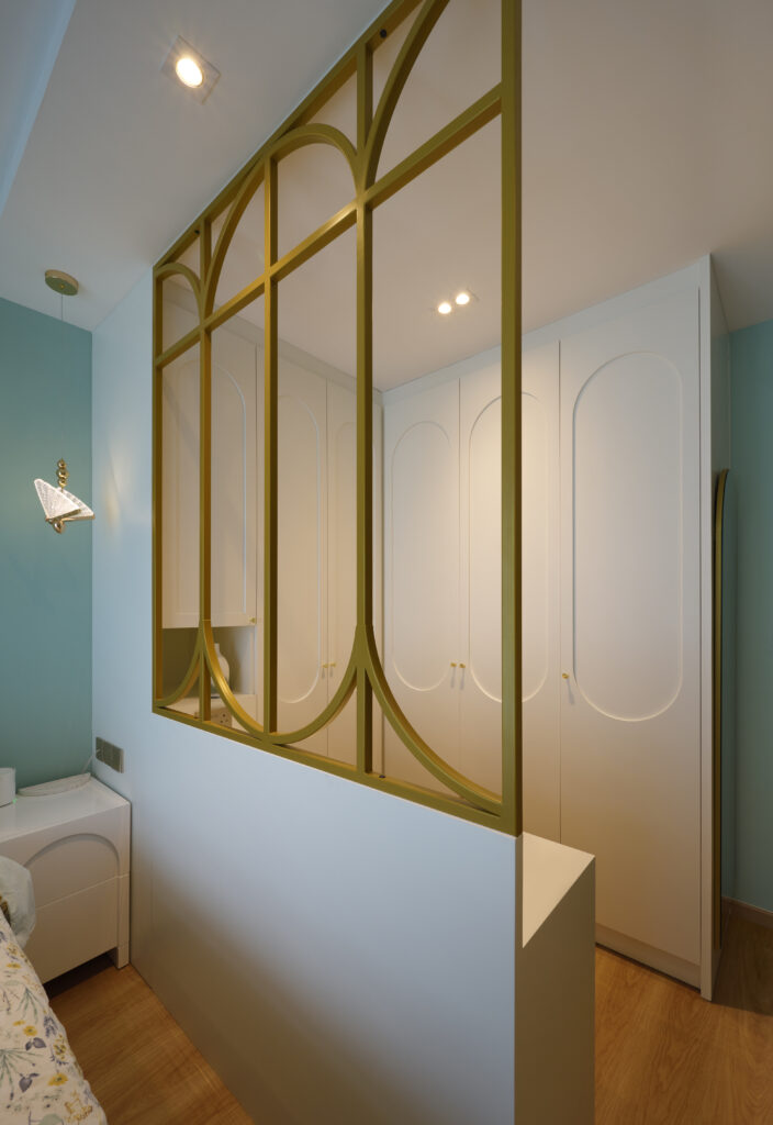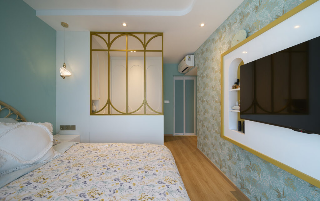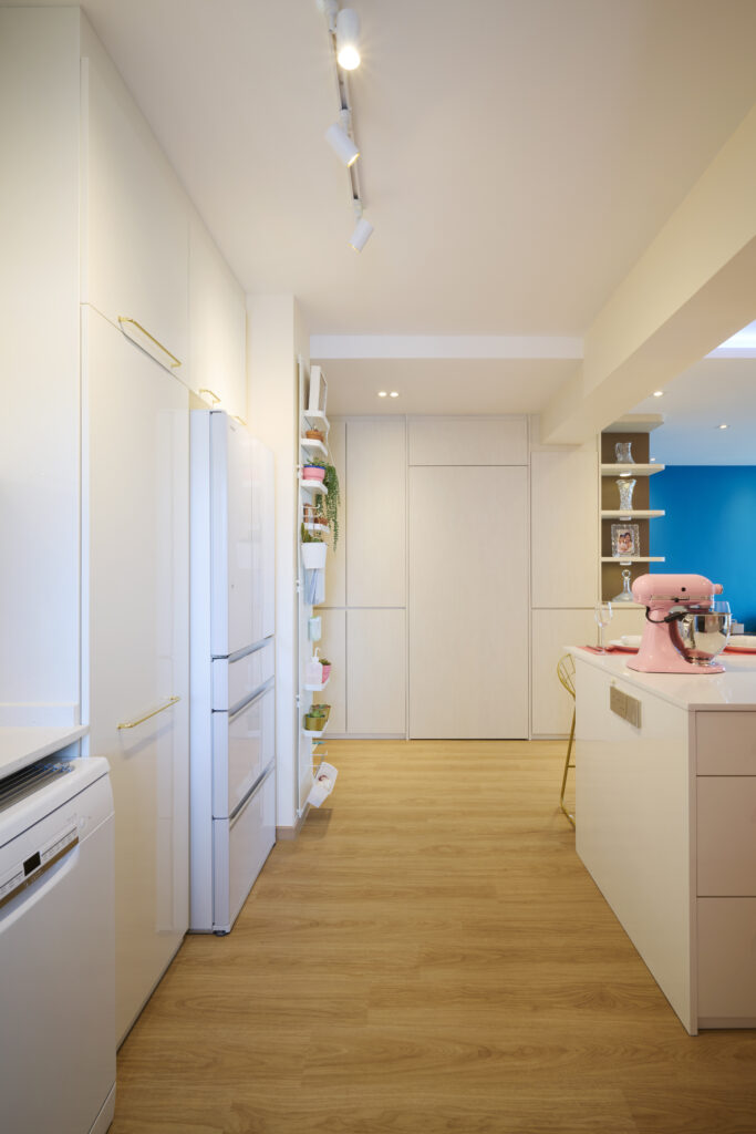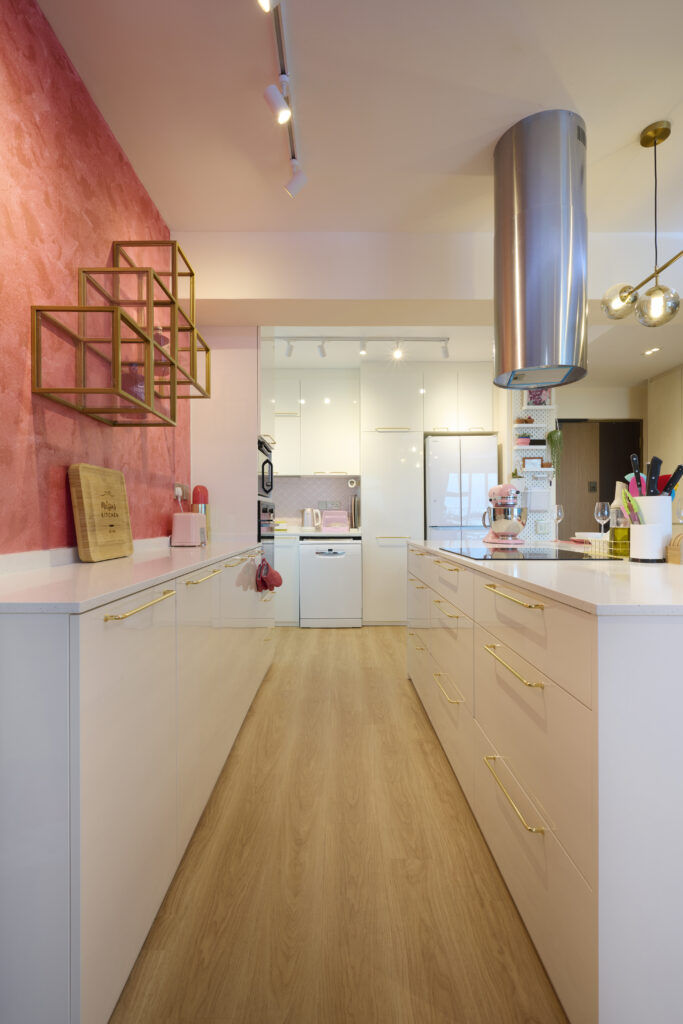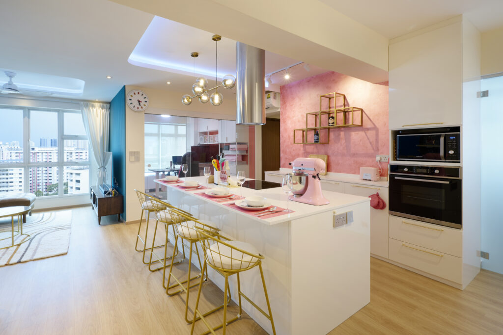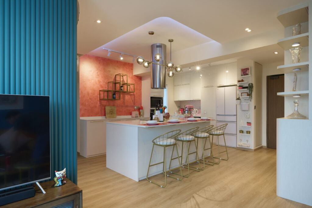 Within the walls of this captivating home, an infusion of pastel colours and artful lighting crafts a narrative of playful sophistication. An adjacent dining space, illuminated by an elegant modern chandelier, promises lively dinner parties and intimate meals alike, all set against the soft wooden textures underfoot.