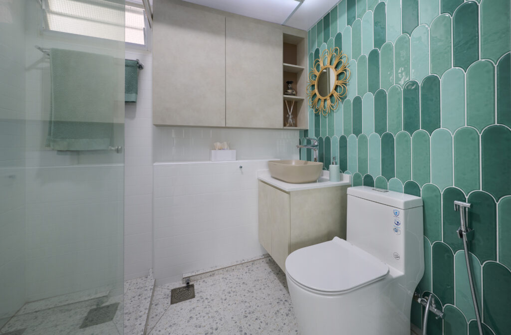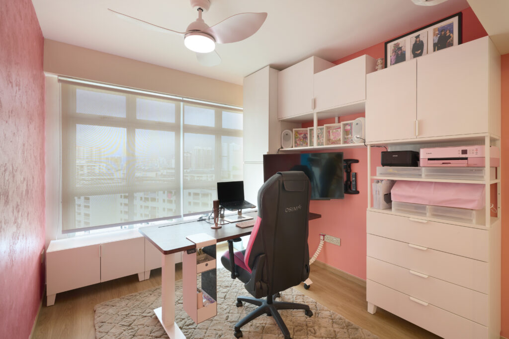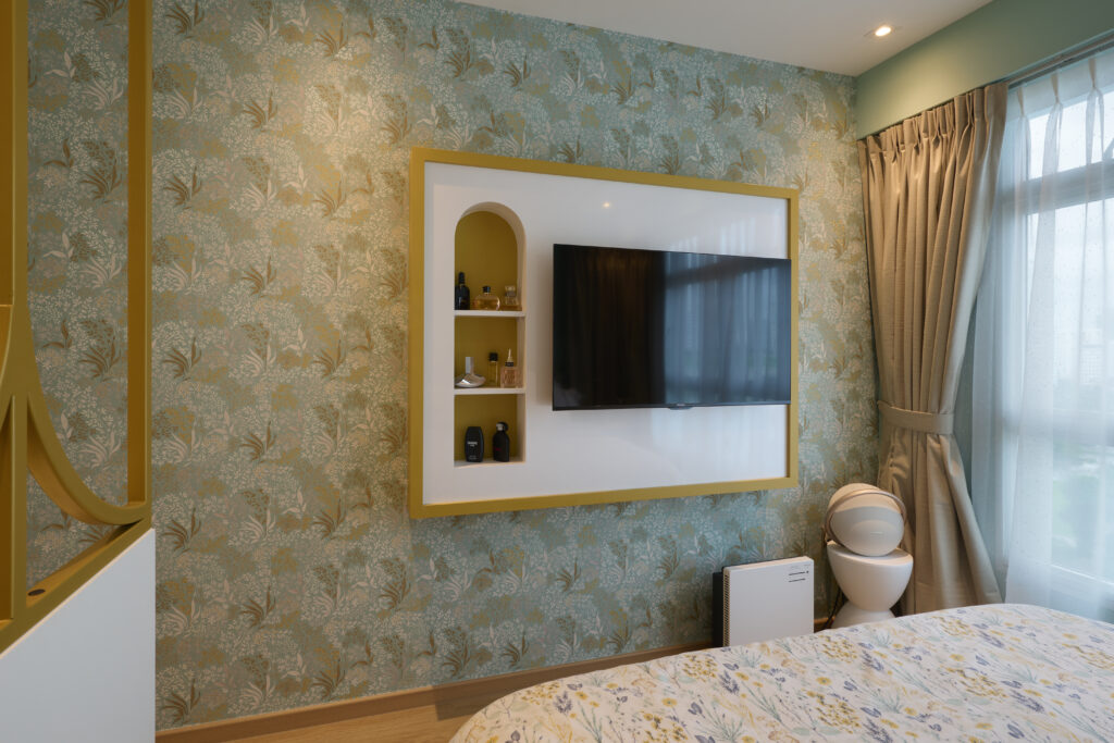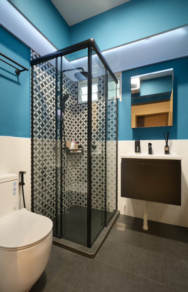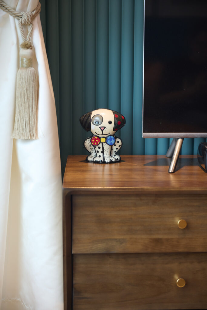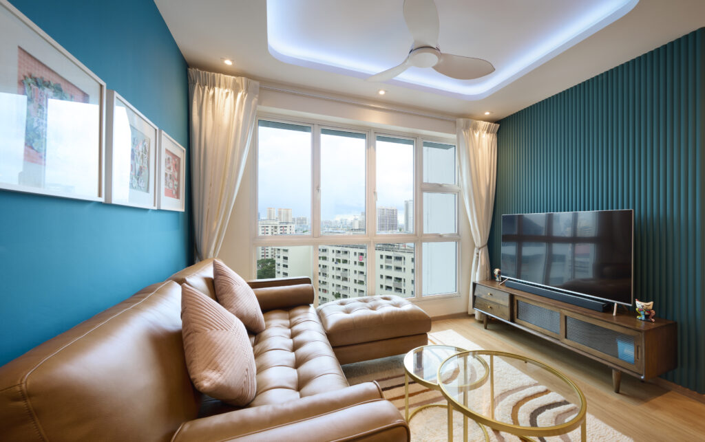 Within the walls of this captivating home, an infusion of pastel colours and artful lighting crafts a narrative of playful sophistication. An adjacent dining space, illuminated by an elegant modern chandelier, promises lively dinner parties and intimate meals alike, all set against the soft wooden textures underfoot.